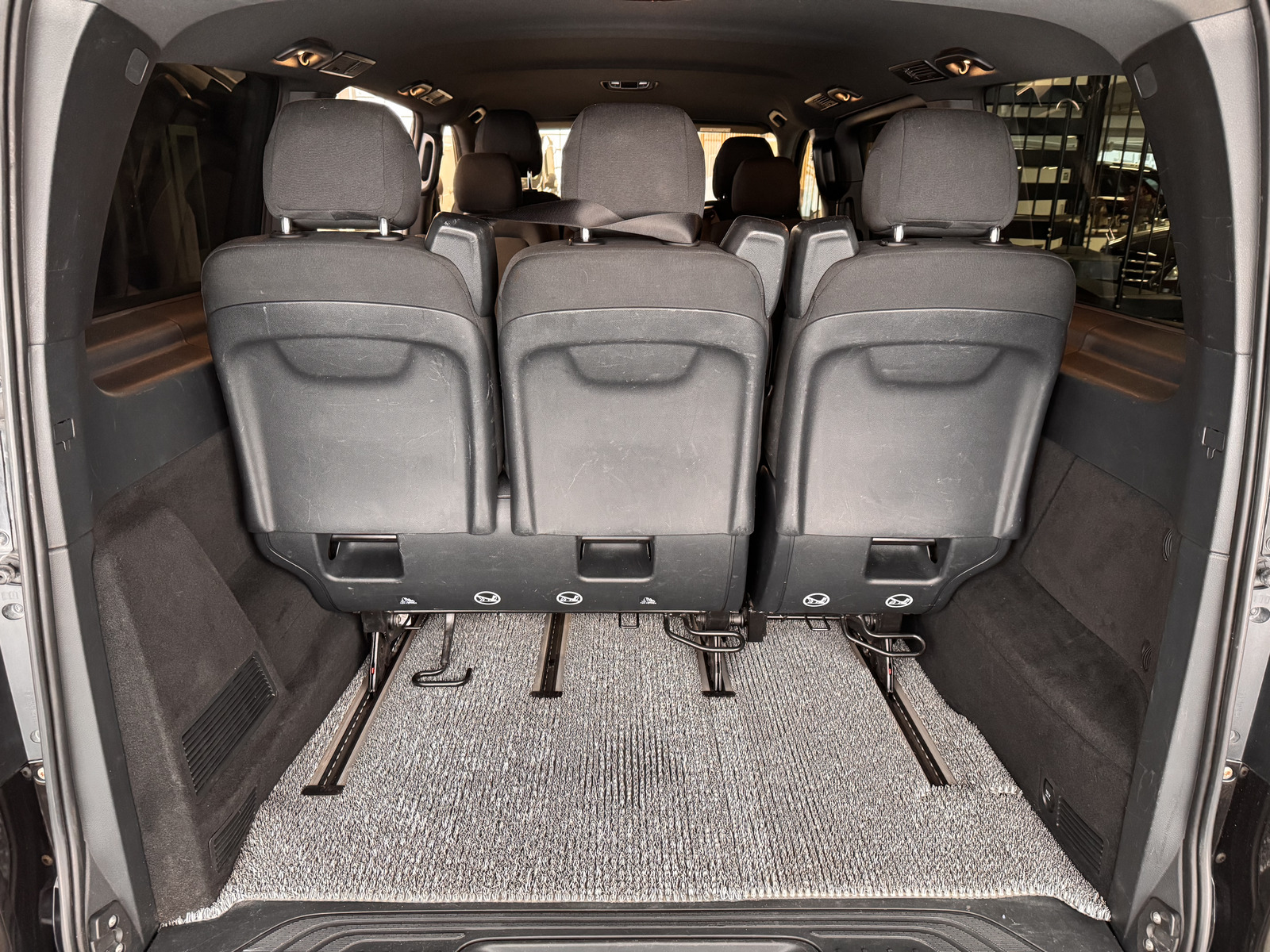 - Takimmainen istuinrivi kolmen istuttavalla penkillä, kun kangasverhoilu